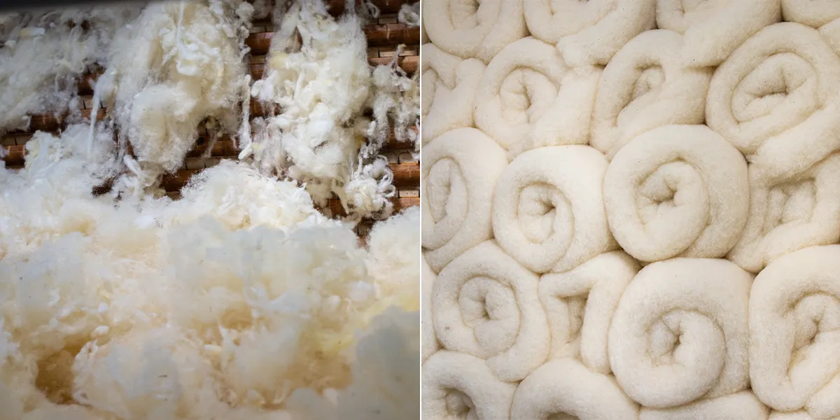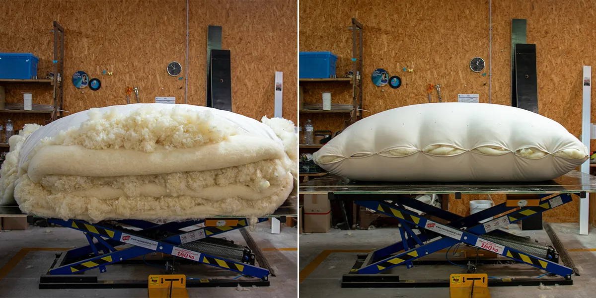 Les produits sont confectionnés à la main, le cardage et le nappage sont mécanisés. Le garnissage consiste à créer un mille-feuille de couches de laine cardée et nappée pour constituer le matelas cousu ensuite à l’aide d’une bordeuse à canon. Il faut 23 kg de laine pour un matelas de 140 cm soit la toison d’environ 20 moutons. Un savoir-faire qui justifie le label EPV.