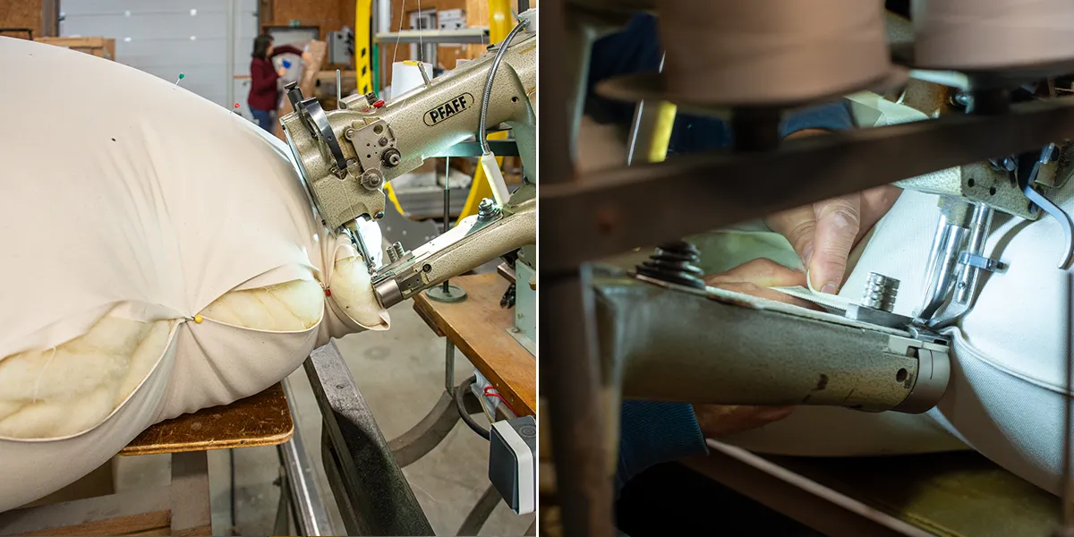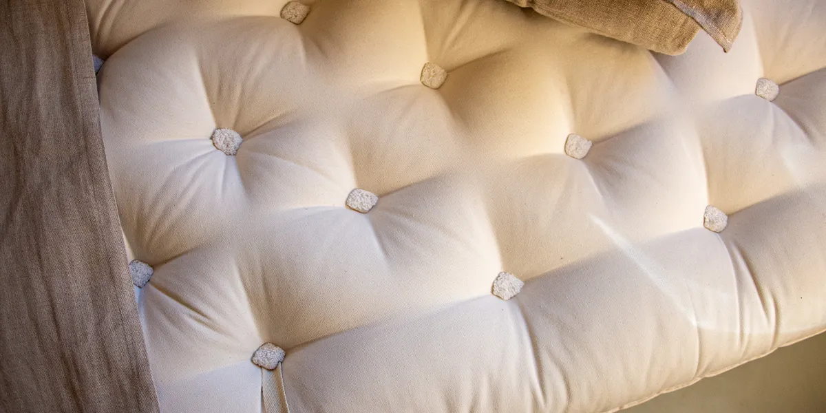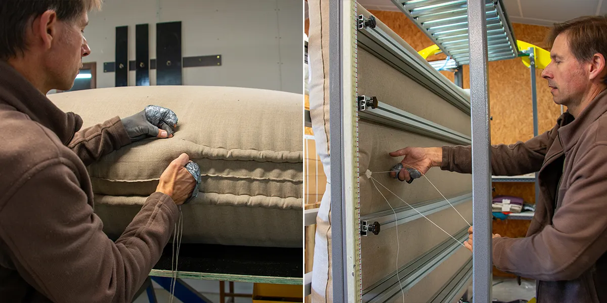 Le bourrelage, la création d’un bourrelet autour, est une option. « Cette opération nécessite 3 h à l’aide d’un carrelet (grande aiguille) ce qui donne de la structure aux matelas et un aspect plus esthétique comme autrefois » signale Marc qui est à la manœuvre. Pour le capitonnage, la dernière étape, les capitons sont cousus à la main en duo et à la verticale depuis l’achat d’un équipement dédié. « Plus on capitonne, plus il y a des points de serrage plus on densifie la laine » précise Marc.