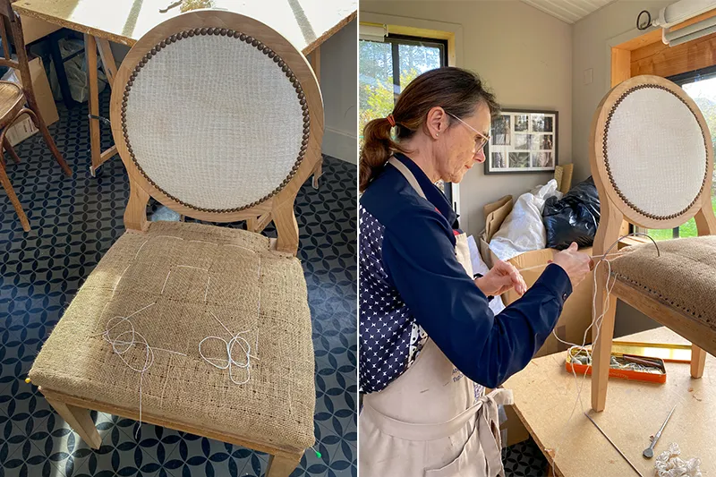 De l’autre côté du mur qui sépare les deux univers, Laurence règne sur le textile, et y exerce son art de tapissière avec la même exigence que son mari. Son atelier est un peu comme une clinique pour fauteuils en cours de restauration. Laurence maîtrise toutes les étapes de la rénovation d’un siège : du sanglage, qui constitue l’ossature invisible, en passant par le rembourrage qui apporte le confort, et jusqu’au choix délicat du tissu final qui donnera sa personnalité au meuble. Chaque intervention respecte les techniques traditionnelles tout en s’adaptant aux besoins contemporains.