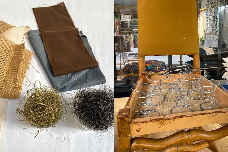 Le métier de tapissier n’a pas attendu la mode du développement durable pour être éco-responsable. « Depuis le 12e siècle, c’est quasiment les mêmes matériaux », affirme Laurence en présentant chanvre, lin, coton, toile de jute, crin végétal ou animal (vache ou cheval). Le crin végétal vient du Maroc, des montagnes du Moyen Atlas précisément, où on le fabrique avec des feuilles délignées, coupées, fendues. Résultat : des fibres solides qui ne se cassent pas. « On le met en première partie, puis on rajoute le crin animal par-dessus. C’est le premier contact sur le siège, c’est plus souple, plus moelleux. »