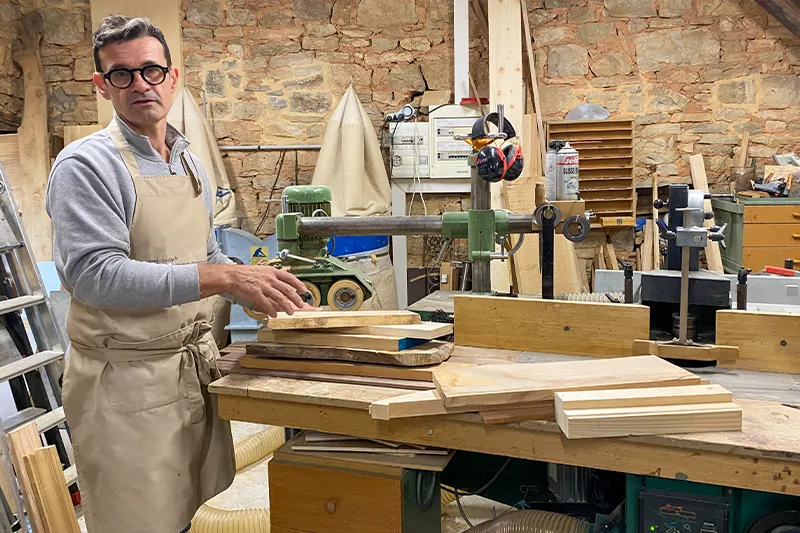 Dans l’atelier de Patrice, le bois est roi. Ébéniste, il crée pour apporter du confort et sublimer l’intérieur, un art à ne pas confondre avec celui du menuisier, qui façonne fenêtres, portes et parquets. Patrice manipule les essences de bois tel un sommelier présentant ses crus, et il est intarissable pour en expliquer les variétés. Son univers sollicite tous les sens : le toucher permet d’apprécier la douceur et la texture, la vue révèle les nuances des veines naturelles, l’odorat est particulièrement titillé par le bois de cèdre. Même l’ouïe est mise à contribution. Chêne, châtaignier, noyer, hêtre… Chaque essence possède sa personnalité unique.