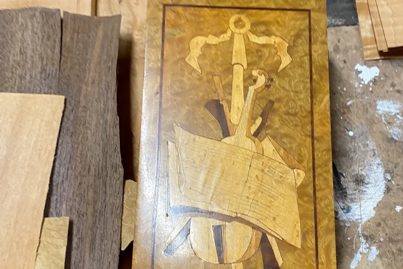 Patrice a fait sa formation chez les compagnons à Limoges pendant trois ans. C’est là qu’il a découvert l’art de la marqueterie et le travail du placage, pour lequel on utilise des feuilles de bois de quelques dixièmes de millimètre qui permettent de concevoir de somptueux décors. Le processus est minutieux : superposer quatre ou cinq essences, reproduire le dessin, puis découper délicatement pour créer une œuvre unique.
