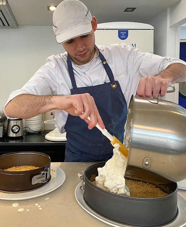 Alexandre en pleine confection du dessert du jour : cheese-cake à la mangue, miam ! © Corinne Mérigaud