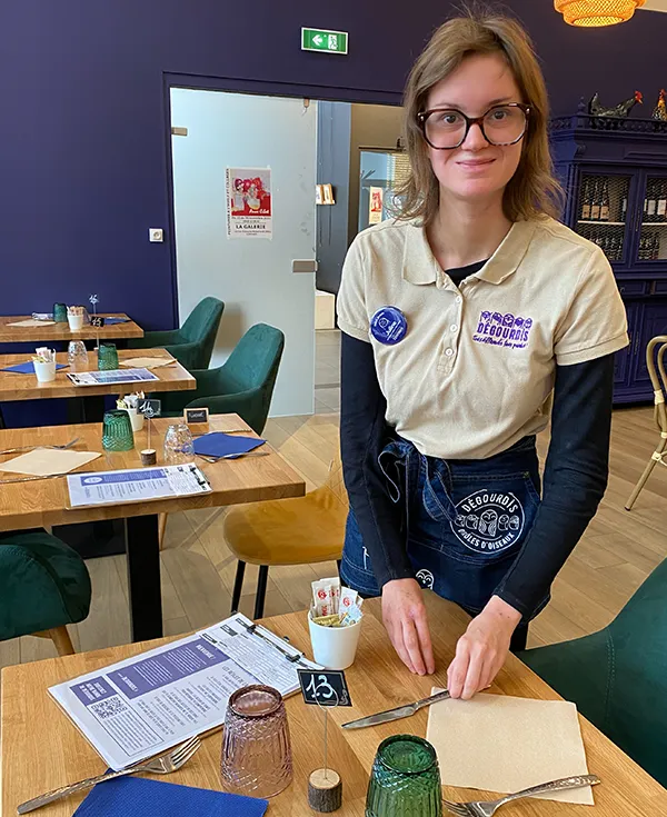 Juline termine la mise en place de la salle avant que n’arrivent les premiers clients. Titulaire d’un CAP petite enfance et d’un Bac Pro Services aux personnes et aux territoires, elle a dû renoncer à son métier après quelques mois d’activité. « Je suis contente de travailler ici, avec les clients ça se passe très bien » se réjouit-elle, « ils sont heureux d’être là, c’est un concept nouveau qui leur plaît. Et mes collègues sont bienveillants.»