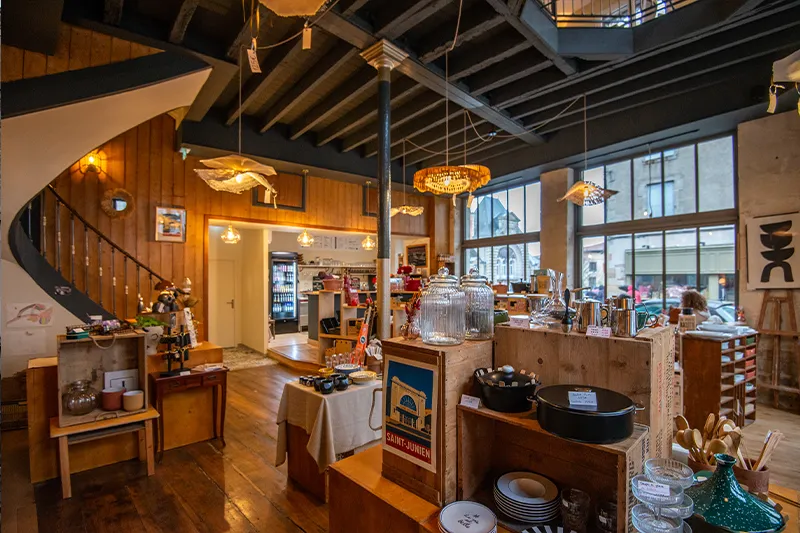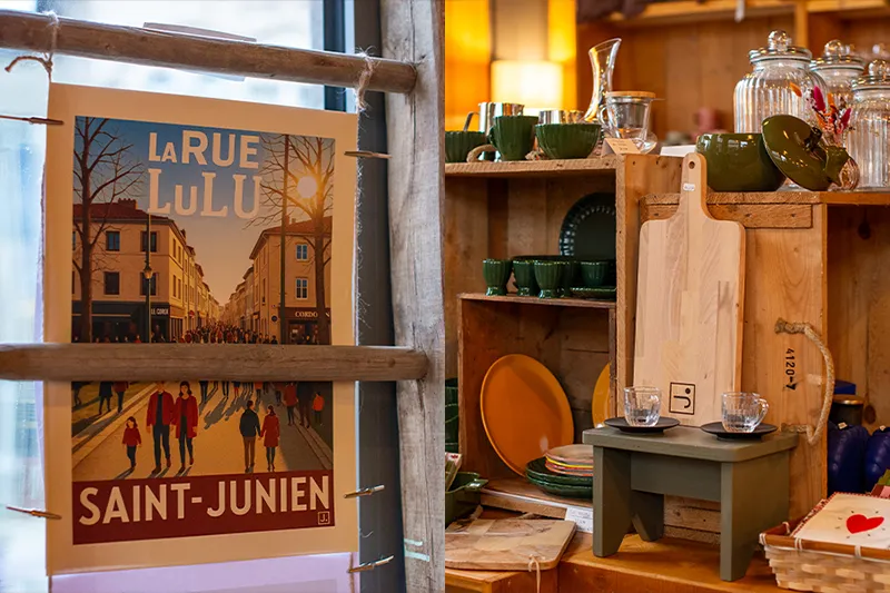Côté arts de la table, on retrouve en bonne place des marques françaises Cookut pour les ustensiles de cuisine en métal recyclé et les verres de la Verrerie La Rochère. La porcelaine provient de La Fabrique à Saint-Brice-sur-Vienne. Une gamme de produits identitaires se décline sous « La Marque des Saints-Juniauds » avec des planches à découper, des bougies, des portes-clés, ou encore des affiches vintage qui représentent cinq lieux emblématiques de la ville…