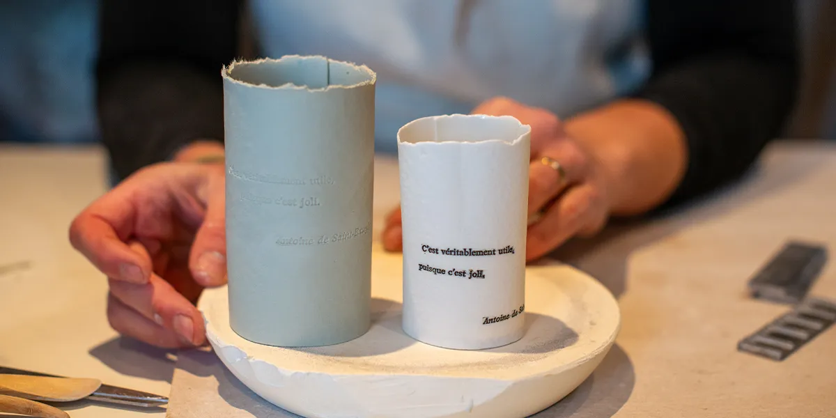 Ils ont aussi créé des photophores avec un message gravé dans la barbotine en lettres typo fournies par le Moulin du Got. S’il faut 15 à 20 minutes pour le fabriquer, 48 h sont nécessaires pour le processus complet dont une cuisson à 1280°. « On consomme deux fois moins d’énergie mais on ne peut pas prétendre au label Porcelaine de Limoges car on cuit dans un four électrique » signale Guillaume.