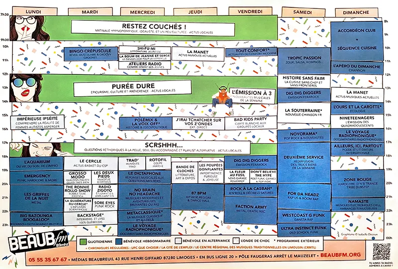 Ce qui fait la force de Beaub, ce sont sa soixantaine de bénévoles qui animent au quotidien la radio. « Le Cercle » pour l’actualité du CSP, « Bande de Cloches » pour la littérature, l’art et les expositions du moment, et des dizaines d’autres émissions variées qui permettent aux auditeurs d’en prendre plein les oreilles ! Ce sont aussi ces mêmes bénévoles, mais aussi les donateurs amoureux de la station qui ont permis à la radio d’installer sa nouvelle antenne ; un investissement financier obligatoire que ne pouvait pas se permettre la radio.