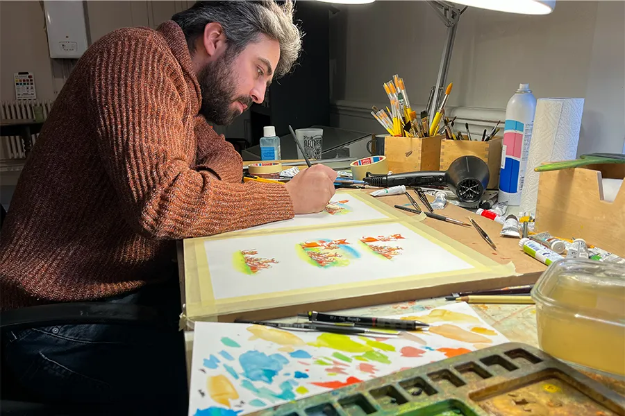 Thibaut Prugne utilise de la gouache avec beaucoup d’eau et un bon coup de sèche-cheveux pour accélérer le processus ! © Jérémy Truant