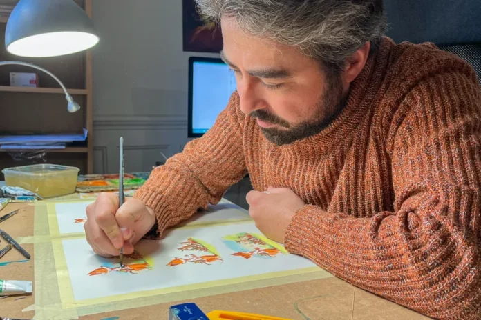 Thibaut Prugne utilise de la gouache avec beaucoup d’eau et un bon coup de sèche-cheveux pour accélérer le processus ! © Jérémy Truant