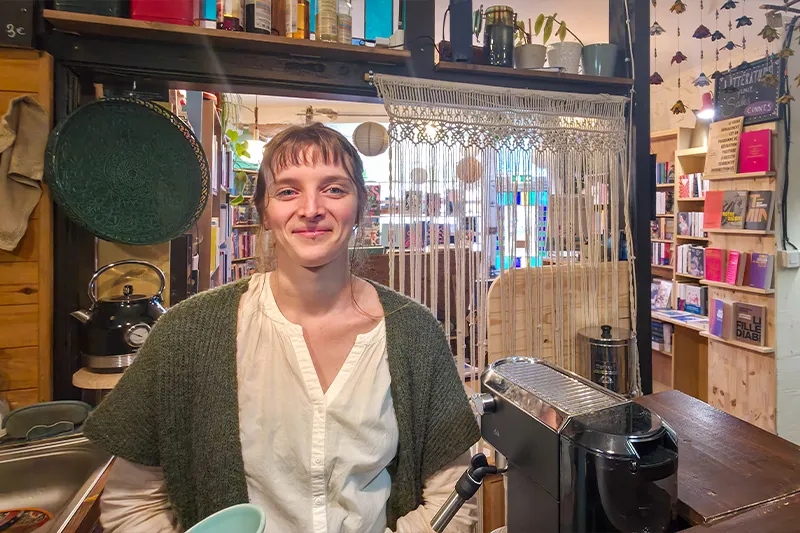 À l’arrière de la librairie, Alix a installé un espace détente : un comptoir pour préparer les boissons et un peu de snacking, une chaise pour le chat et, au fond, des tables, un canapé et deux fauteuils. Un lieu cosy et chaleureux qui donne envie de s’installer pour profiter d’une pause. Elle accueille aussi ponctuellement des rencontres avec des auteurs, des lectures publiques ou des événements culturels. « Ce n’est pas une grande salle de conférence, mais justement : ici tout se fait à taille humaine. Les échanges sont souvent très directs, et très chaleureux. »