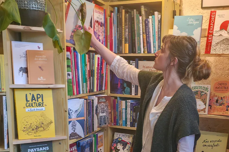C’est finalement à l’automne 2022 que la Petite Librairie Sauvage est inaugurée. L’espace est divisé en deux. Dès l’entrée, les rayonnages occupent le devant de la boutique. Littérature contemporaine, classiques, polars, essais, livres jeunesse, bandes dessinées, ouvrages illustrés, mangas : entre 1 000 et 1 300 titres composent une sélection volontairement resserrée, avec de nombreux livres de maisons d’édition indépendantes ou d’auteurs reconnus.