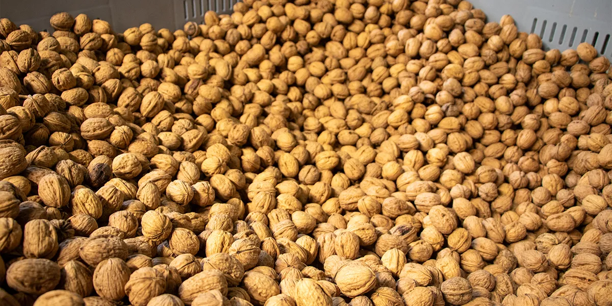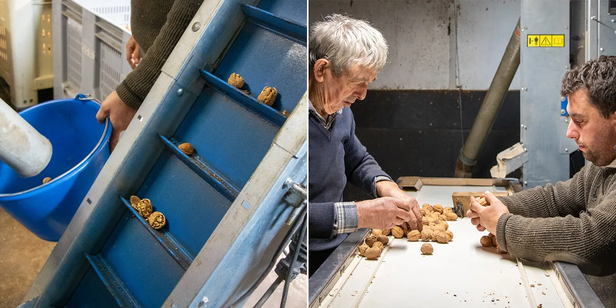 Sur l’exploitation, deux variétés sont cultivées : la Marbot, une variété née ici en Basse-Corrèze ; et la Franquette, très connue en France. « Les noix sont tombées fin septembre début octobre, on les ramasse puis elles sont lavées à l’eau, puis partent dans une trémie où elles sont frottées entre elles et triées », décrit la nucicultrice. Au « Moulin de la Vie Contée », il y a pas moins de 1 000 noyers, plantés il y a une dizaine d’années en respectant le cahier des charges imposé par l’AOC Noix du Périgord. Place ensuite à la partie séchage dans le bâtiment de l’autre côté du petit chemin. Ici, les noix sont séchées durant 72 heures à 27° C, avant d’être triées par diamètres de calibrage.