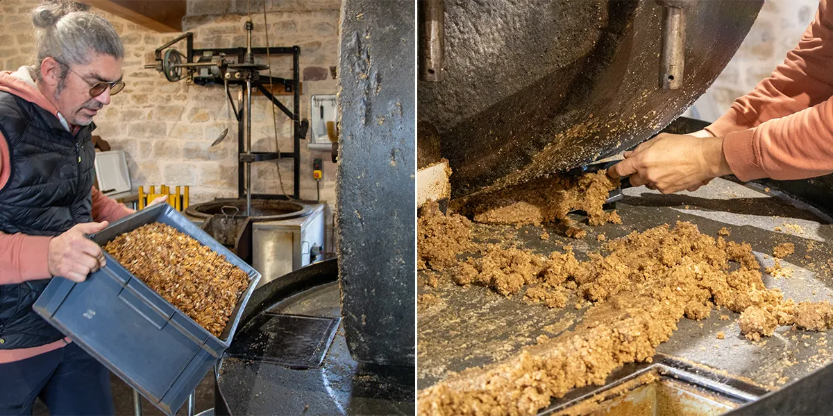 Au centre de la magnifique grange-étable en pierre du XIXe siècle se trouve la pièce ou plutôt les pièces principales du processus de fabrication de l’huile de noix : une meule en granit du Berry posée sur son « dormant » (la pierre horizontale), un chaudron en fonte et deux presses en fonte des années 1920. C’est donc dans cet espace que le cerneau devient précieux liquide, comme l’explique Anne : « On fait des pressées de deux fois quinze kilogrammes. La meule écrase la noix et ça forme une pâte. » C’est cette pâte jaunâtre qui est ensuite chauffée dans le chaudron.