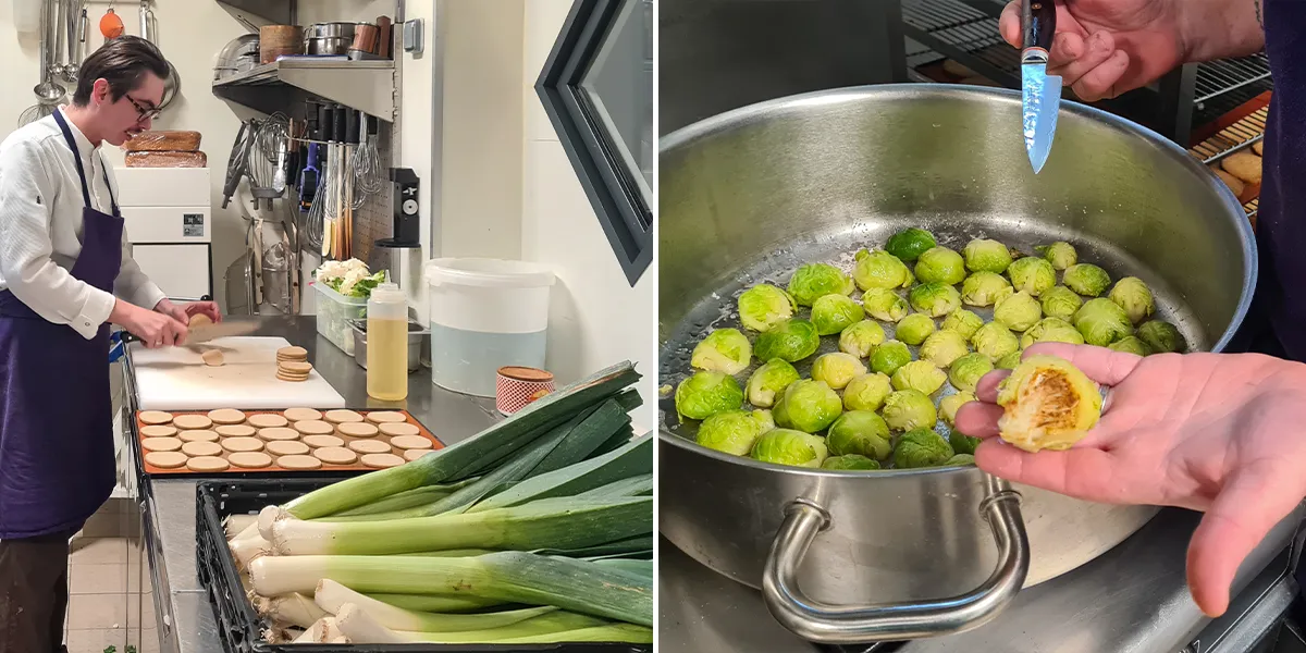 Cuire des choux de Bruxelles sans eau ou faire une huile au goût d’agrumes avec le vert des poireaux… Jérémy Cannesan trouve des solutions pour réduire au minimum ses consommations et ses déchets © Pauline Sutter