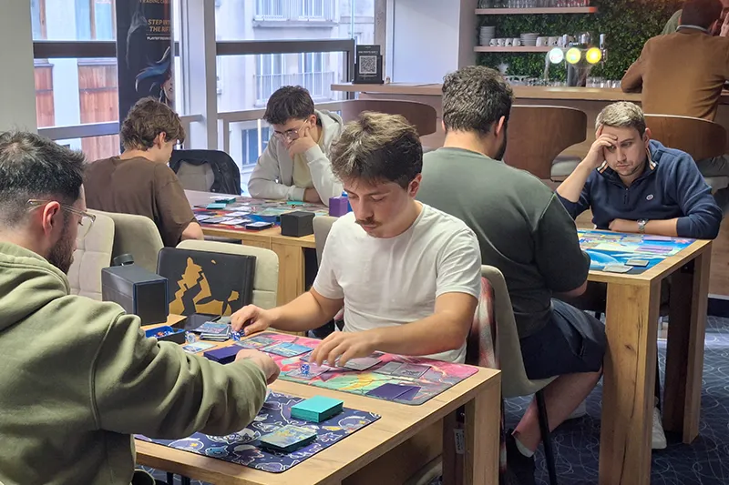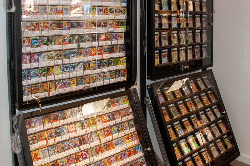 L’autre ambition des associés était de créer un lieu qui n’est pas exclusivement centré autour de Pokémon. « C’est sûr que Pokémon occupe une grosse place dans nos locaux. » sourit Romain. « Mais on voulait faire un lieu où l’on trouve de tout, que ce soit avec les cartes des licences les plus populaires : Yu-Gi-Oh !, Lorcana et même les cartes de sports ! Mais aussi des jeux de société. On avait aussi la volonté de proposer aussi un espace de jeu où les clients peuvent venir tester des jeux autour d’un verre ! »