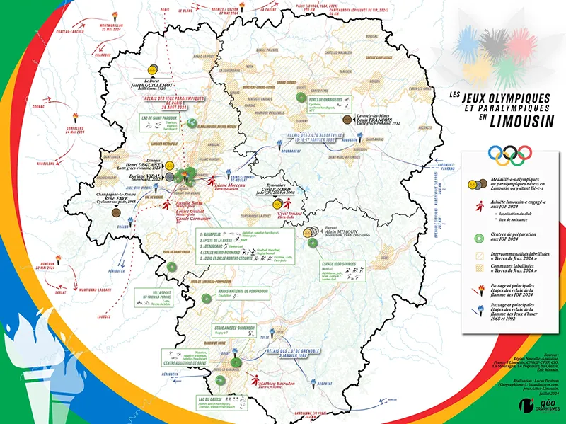 Pour apporter notre petite contribution à cette grande rétrospective consacrée aux sportifs locaux, on vous repartage la carte que nous avions réalisé l’an dernier avec Lucas Destrem, à l’occasion des Jeux de Paris 2024, qui illustre le Limousin… olympique !
