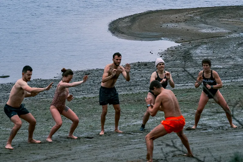 « On va passer à la phase de préparation qui sera la même que celle de réchauffement », nous prévient Pierre Barbanceys en présentant deux exercices de mouvements sans créer trop d’effort dont le principal but est donc de nous échauffer. Les corps sont prêts, les esprits ont l’air aussi. En maillot de bain, nous avançons vers le lac, dont le niveau est bien bas en cette saison. Au loin, sur son petit bateau, un pêcheur doit se demander ce que nous sommes entrain de faire. Je me le demande aussi. « Quand vous serez prêt, vous pourrez avancer dans l’eau, uniquement quand vous le sentez et laissez vos mains à l’extérieur », conseille le coach.