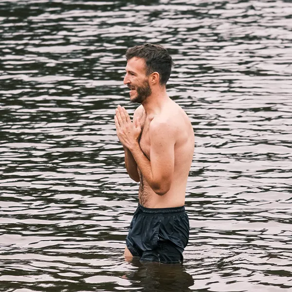 Allongé sur des tapis de yoga, on commence donc des exercices de respiration inspirés de la méthode « Wim Hof » (voir plus bas…). On inspire et on expire plusieurs fois puis on retient. Les cycles de respirations profondes et de rétentions préparent le corps en augmentant momentanément l’oxygénation et en activant le système nerveux, ce qui facilite l’entrée dans un environnement froid. Sur le plan mental, tout le monde semble concentré. Le calme s’installe durant ces 20 minutes en apesanteur au son d’une musique douce. « J’inspire, je gonfle le ventre, les côtes, les poumons, je sens l’air envahir mon corps … puis j’expire », récite notre guide du souffle en marchant autour de nous. Les yeux fermés, je vois l’eau du lac se rapprocher de plus en plus. Des frissons me traversent.