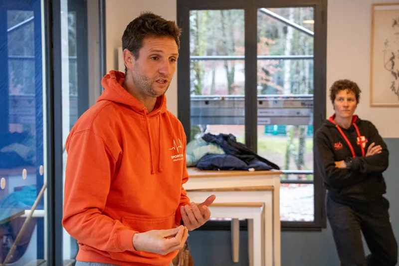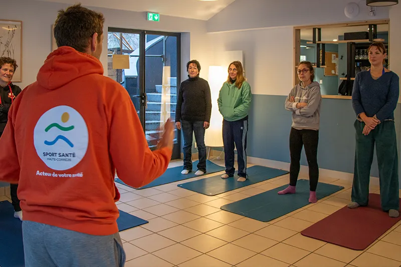 Nous sommes d’ailleurs dans le restaurant, transformé en salle de yoga pour l’occasion. « Le lieu est très bien adapté. On a la salle, le lac à côté, le spa dans les lodges juste au-dessus, c’est parfait ! » nous rassure Pierre Barbancey. Dans une ancienne vie, il a été professeur d’EPS, avant de passer un diplôme universitaire sur la nutrition, de se former sur la respiration et la thérapie par le froid et par le chaud et de travailler un temps à la Clinique du souffle à Riom-ès-Montagne dans le Cantal…