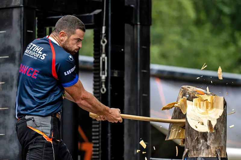 • le Hot Saw (tronçonneuse de compétition), où les athlètes doivent couper trois disques dans une section de 15 cm de large à l’aide d’une tronçonneuse extrêmement puissante et modifiée.