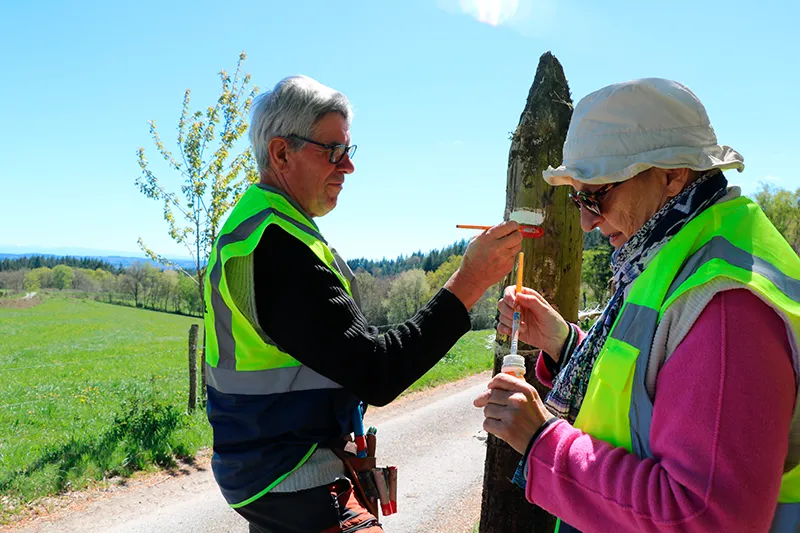 Ce qui permet la pérennité des GR®, c’est aussi un balisage réalisé minutieusement par des bénévoles engagés sur les chemins, toute l’année. Nous sommes allé les rencontrer, près du hameau de Saugeras, au-dessus de Meymac. Chasubles fluo sur le dos, Jean-Paul et Pascale arpentent le tracé, donnent un coup de peinture rouge et blanche là où c’est nécessaire et débroussaillent aussi parfois.