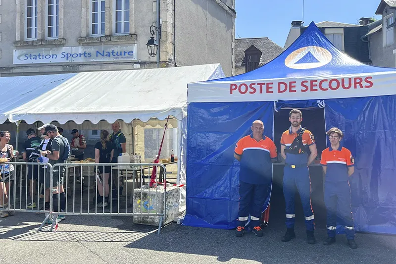 « Il est midi, c’est encore calme mais la température monte, les corps ne sont pas habitués », explique Alexis qui poursuit : « On soigne des ampoules, des éraflures, des malaises … ». Derrière lui, la radio se déclenche : « Entorse à la cheville sous le pont de Treignac ». Alexis court jusqu’à l’ambulance. La journée continue et les petits secours s’enchainent.