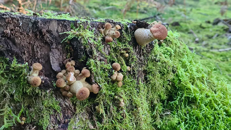- Le fleurissement du mycélium : avant l’apparition de nos compagnons aux petits chapeaux, un fin feutrage blanc se développe sur le sol ou le bois en décomposition. Ce n’est pas de la mousse, mais bien la promesse de futurs champignons !