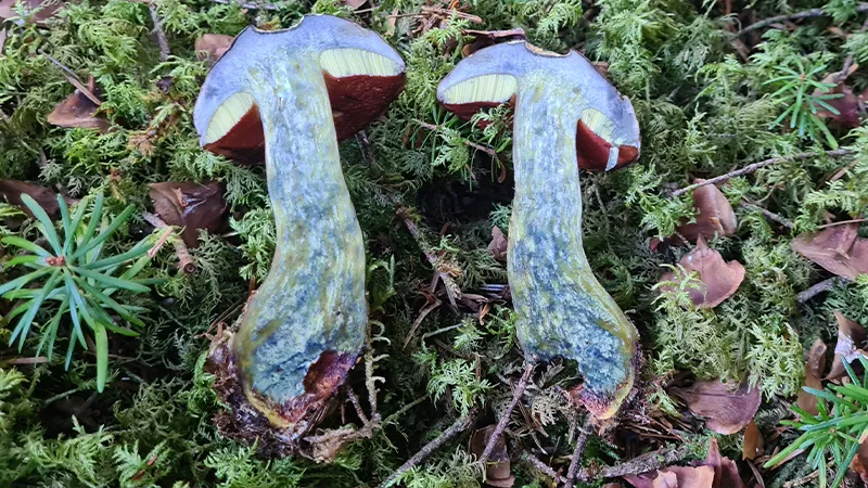 - Les changements de couleur : certains champignons changent de couleurs quand on les coupent, en réagissant presque instantanément à la lumière et à l’air. C’est le cas du bolet indigotier (Gyroporus cyanescens).