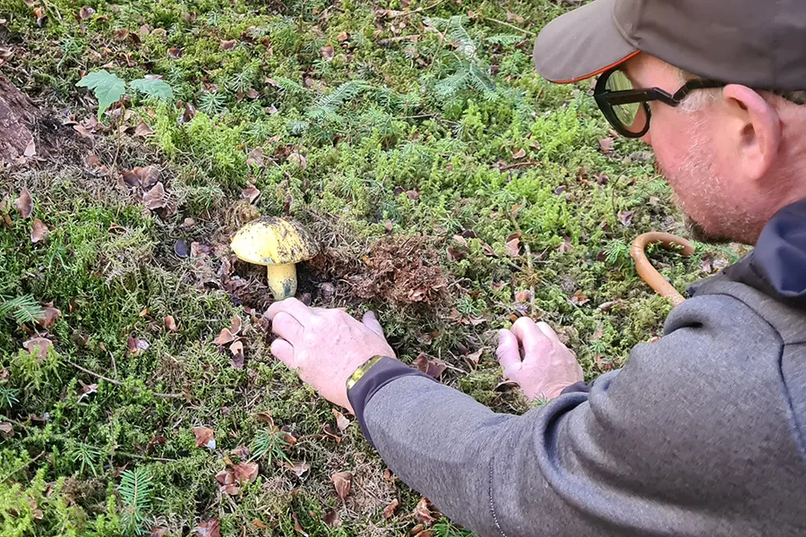 Ces inventaires permettent aussi la découverte d’espèces extrêmement rares, comme ce bolet jonquille (Neoboletus junquilleus), classé « à protéger », que Claude et Romain ont découvert pendant notre balade.