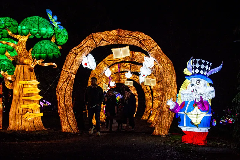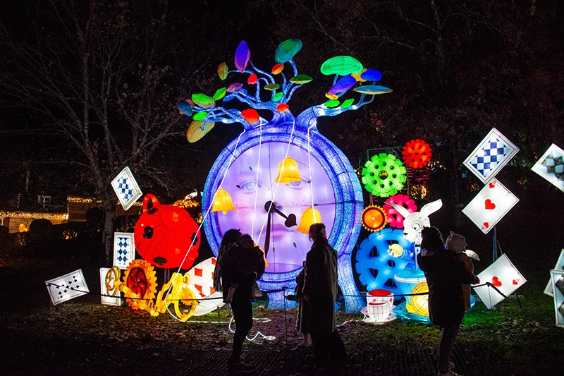 Dès l’entrée, c’est une plongée dans un monde où se croisent un lapin pressé entre deux buissons, des champignons colossaux ou encore des cartes géantes. Dans les allées, petits grands ne savent pas où donner de la tête tant les lanternes et les lumières s’étalent à perte de vue. « Viens voir, il y a un dragon qui bouge là-bas ! », lance le petit Elliot venu de Haute-Corrèze pour admirer le spectacle.