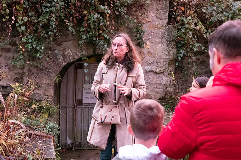 Très vite, Anne Schantz nous rejoint. Elle est conférencière dans la ville de Limoges depuis presque 25 ans, et elle connaît la ville comme sa poche y compris ses sous-sols ! Aujourd’hui, pas d’histoire ou de découverte, notre guide se transforme en conteur le temps d’un après-midi. Une fois les troupes rassemblées, notre Grimm du jour, nous invite à la suivre. « Vous êtes prêt à embarquer dans une aventure unique ? À arpenter les souterrains de Limoges ? », lance-t-elle. “Ouuuiii !” répond en cœur l’assemblée, l’excitation est à son comble.