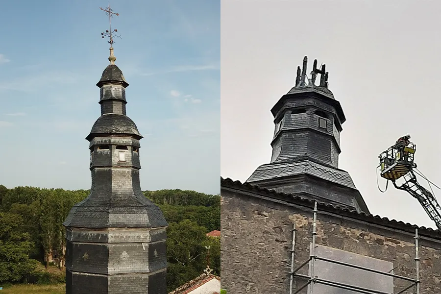 Dès juin 2022, la municipalité a commandé un état des lieux du clocher à un architecte spécialisé. Et son diagnostic n’est pas des plus réjouissants : en plus des importants dégâts causés par l’incendie, le clocher souffre d’un important désordre structurel, antérieur au drame, qui fait pencher le clocher de 4 degrés. Dans son rapport, il note aussi que l’édifice se détériore à vitesse grand V et nécessite de toute urgence une restauration.