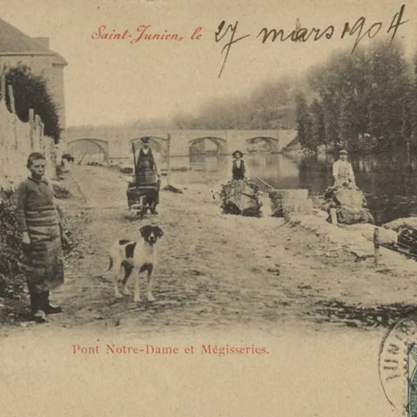 Le « travail de rivière » des mégissiers Saint-Juniauds au bord de la Vienne en 1904 – Document conservé aux Archives départementales de la Haute-Vienne, sous la cote 46 Fi 9