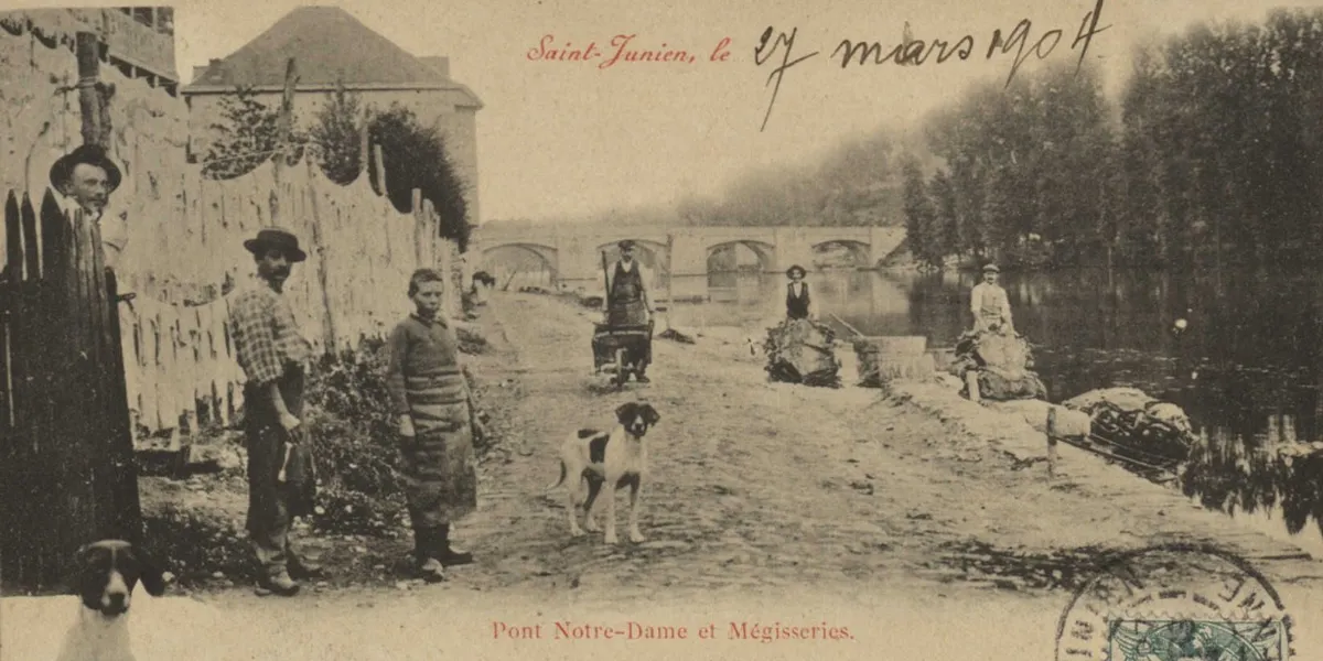 Autrefois, le quartier des Mégisseries à Saint-Junien s’étendait en bord de Vienne, entre l’aval du pont Notre-Dame et l’îlot des Seilles, et bruissait de l’activité des nombreuses tanneries et mégisseries. Au début du 19e siècle, le cadastre napoléonien répertoriait une douzaine de tanneries. Vers 1850, des mégisseries artisanales sont fondées par des gantiers locaux et remplacent les tanneries. Mais face à la concurrence des mégisseries industrielles, bâties à partir de 1875, ces dernières vont malheureusement péricliter.