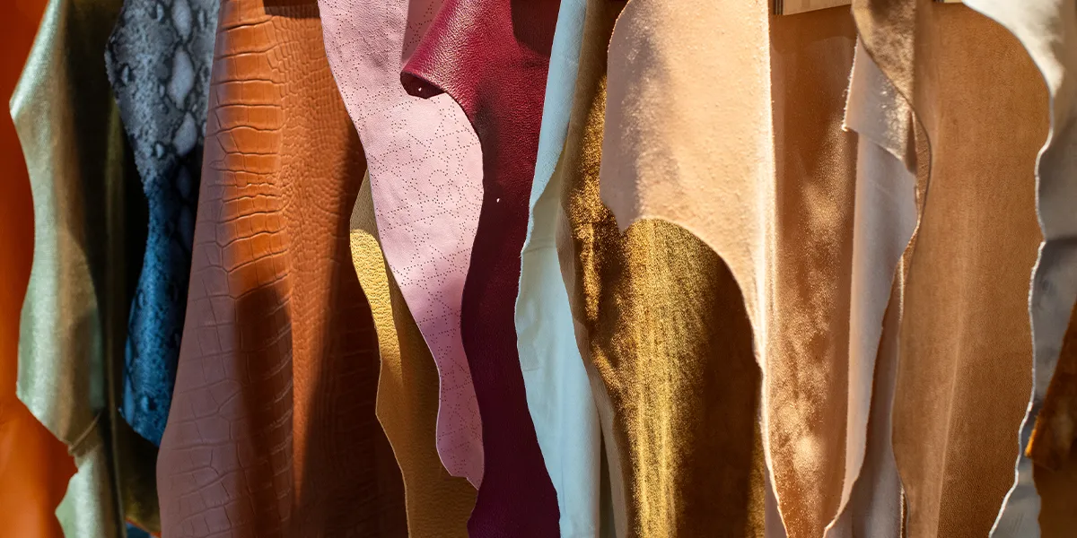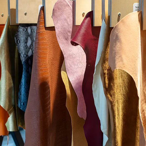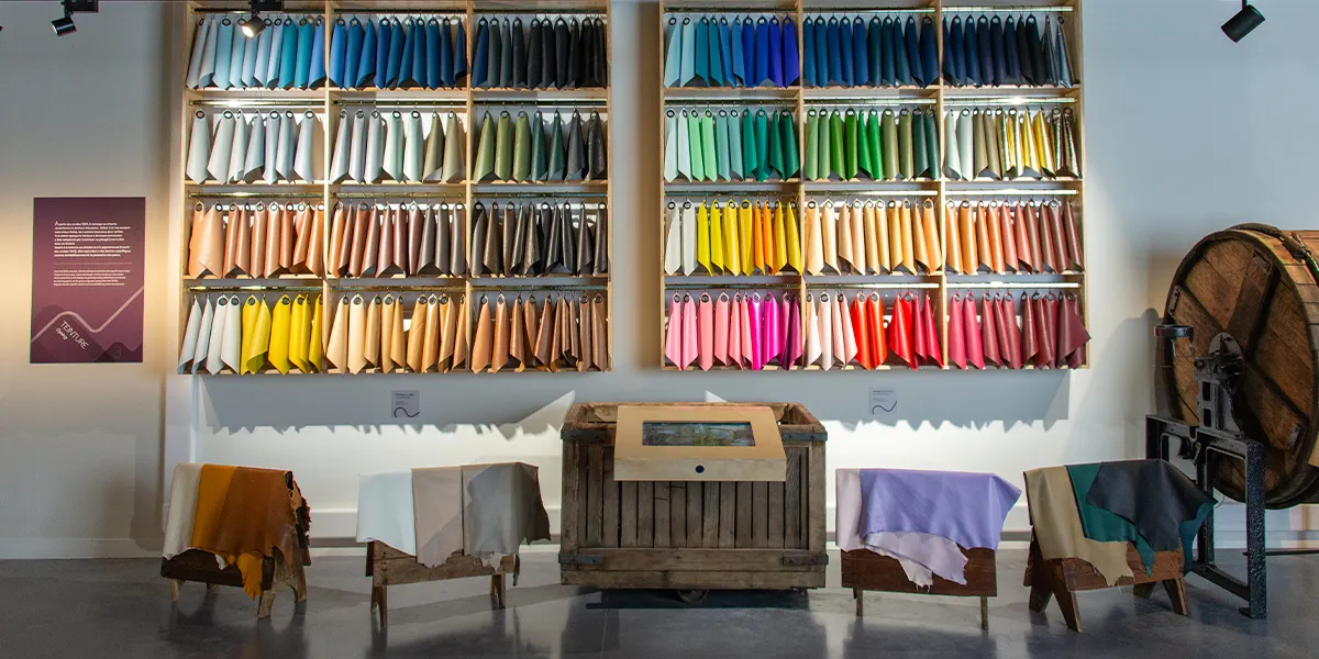 La « cuirothèque » de la Cité du Cuir présente des dizaines de cuir provenant de différentes espèces et même des imitations synthétiques bluffantes ! © Brice Milbergue