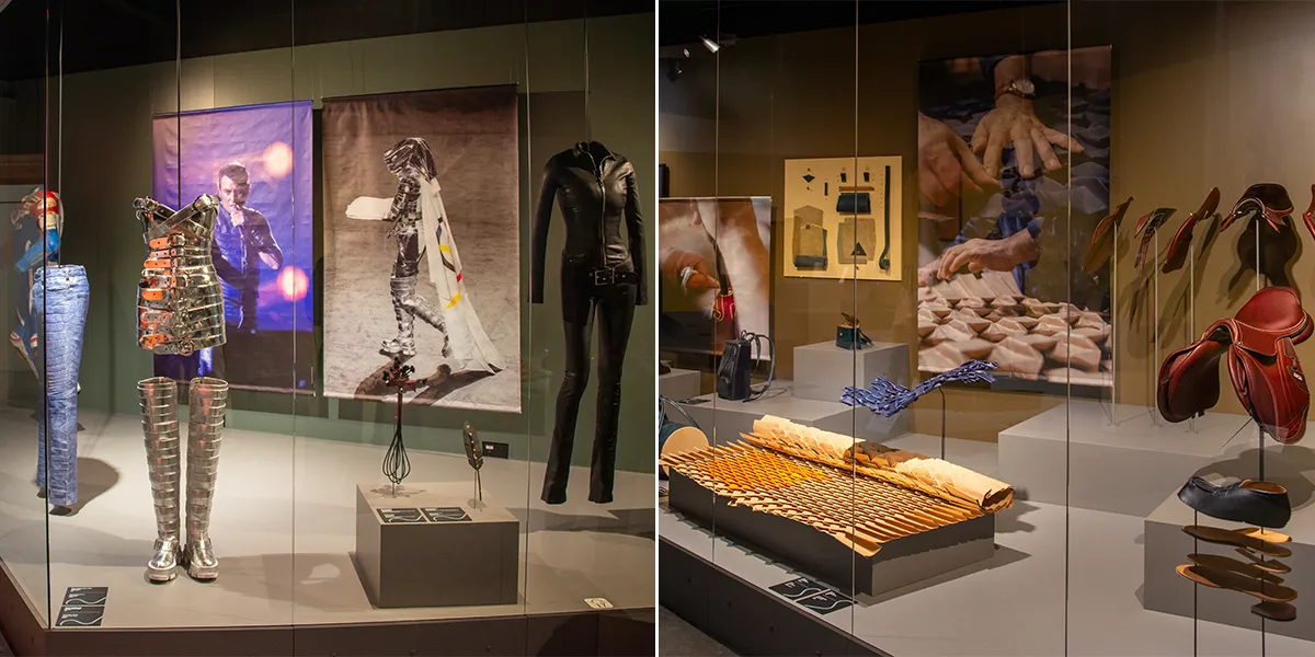 La visite se termine par une galerie du cuir consacrée à la création contemporaine et à l’innovation. Les nombreuses applications de cette matière mettent en avant ses propriétés utilisée que ce soit pour se protéger comme la combinaison de moto Vital Sport, pour se produire sur scène avec le sublime pantalon en cuir bleu créé par Jean-Claude Jitrois pour Johnny Hallyday ou encore pour ranger avec le premier sac haut à courroies d’Hermès dans lequel les cavaliers mettaient leur selle et leurs bottes. On découvre également des associations originales de matières comme le cuir et le verre ou bien le cuir et la porcelaine. Une vitrine est dédiée au savoir-français avec des créations signées Hermès ou par des fabricants limougeauds comme les baskets personnalisables Uniqua et l’intemporel mocassin 180 de J. M. Weston présenté en version éclatée.