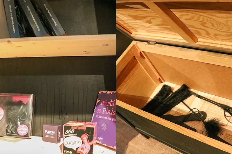 À gauche du lit, une malle renferme un fouet, un plumeau et des bandeaux de soie. Derrière, on trouve une « bibliothèque coquine avec à disposition de nombreux livres et revues ainsi qu’une grande sélection de jeux sur la thématique (cartes, dés, plateaux, roulettes, défis …). Il y a aussi deux coffres forts qui sont une prestation en plus à la demande. Dedans, il y a des cosmétiques comestibles, des huiles et bougie de massages et des jouets plus intimes », note Honorine.