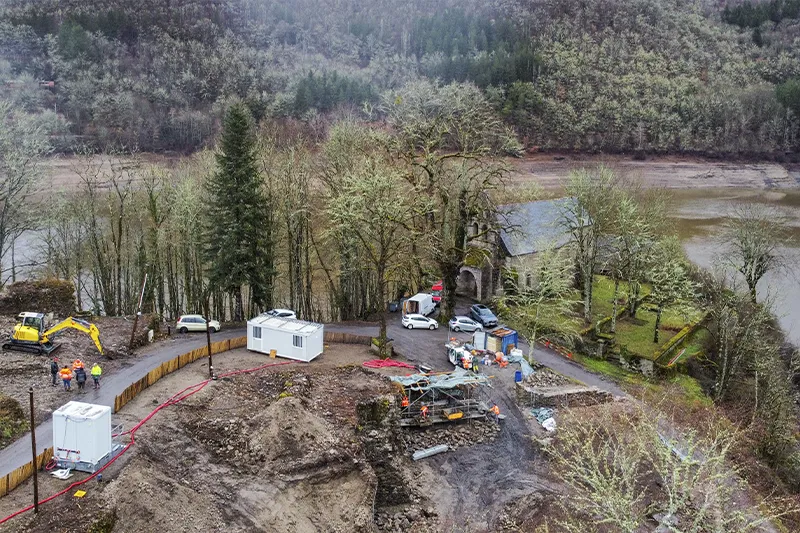 D’un pas franc, Thierry Tromas et Nicolas Jouve s’avancent sur la petite route. Le premier est chef du Service Ingénierie et Travaux du Conseil Départemental de la Corrèze. Le second est maire de Confolent-Port-Dieu, l’une des plus petites communes du département avec ses 43 habitants. On comprend alors que pour entamer un tel chantier de restauration, le village avait besoin d’aide. Coût estimé : 1,2 million d’euros, dont 900 000 € pour le Département de la Corrèze, le reste pour la Commune de Confolent-Port-Dieu et le Conservatoire du littoral (propriétaire de terrains sur les rives de la retenue de Bort).