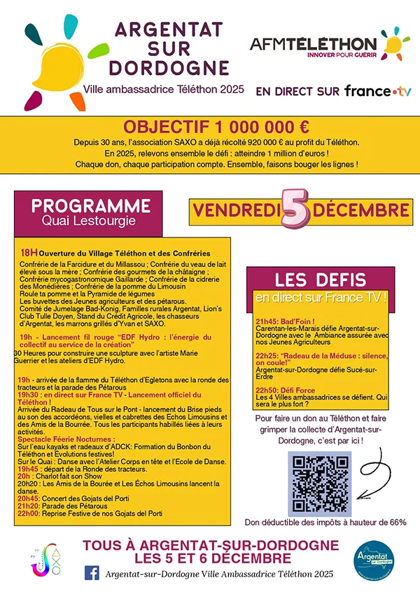 Si Argentat en Corrèze a été choisie (pour la seconde fois) pour être « ville-ambassadrice » du Téléthon 2025 ces 5 et 6 décembre, ce n’est pas pour rien. C’est parce que depuis 30 ans, ici en Xaintrie, on soutient la recherche et on s’y investit même corps et âmes. « On a toujours organisé beaucoup d’événements pour le Téléthon depuis 1995. En 2008 déjà, on avait été ville ambassadrice et on l’est à nouveau cette année », commence Jean-Claude Leygnac, président de l’association Saxo, Solidarité Argentat Xaintrie Organisation qui est à l’œuvre. Depuis 30 ans, les Argentacois n’ont pas ménagé leurs efforts et ont déjà récolté… plus de 900 000 € de dons ! Alors cette année, à l’occasion des trente ans, l’association Saxo a un objectif en tête : franchir la barre du million d’euros. « C’est bien parti ! », confie le président.