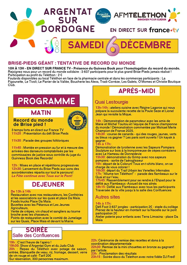 Ce week-end, la ville d’Argentat-sur-Dordogne en Corrèze fait partie des quatre villes ambassadrices du Téléthon à être mises à l’honneur durant les 30 heures de direct sur France Télévision. Les bénévoles vont tenter entre autre de battre un record : réunir 3 637 participants autour du pas de danse du brise-pied.