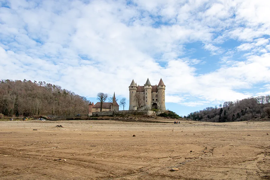 Tout autour du Château de Val, l’eau s’est retirée et la Dordogne a laissé derrière elle des paysages lunaires, des arbres sans feuilles et des murets couverts de vase. Le sable s’étend sur des dizaines de mètres au pied de l’édifice médiéval du XVème siècle. Là où, d’habitude, les vaguelettes viennent taper le mur qui soutient la cour. Le Château de Val a retrouvé son promontoire rocheux duquel il dominait avant la mise en eau du barrage en 1951.